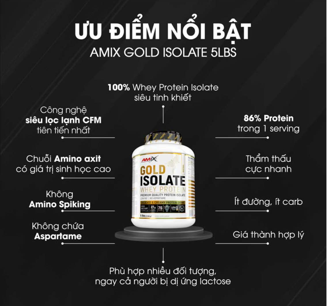 Gold Isolate Whey Protein là sản phẩm sữa tăng cơ cao cấp, bổ sung nguồn protein chất lượng đến từ nhà Amix Nutrition. Sản phẩm này sẽ cung cấp nguồn Whey Isolate có giá trị sinh học cao, hỗ trợ tăng cơ nạc tối đa chỉ sau một thời gian ngắn sử dụng.