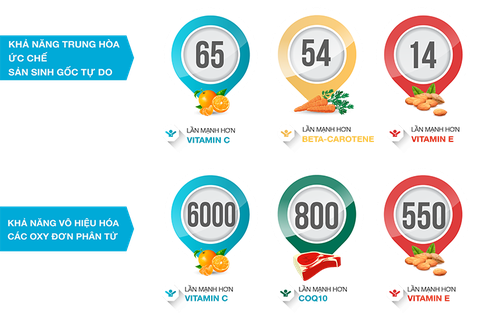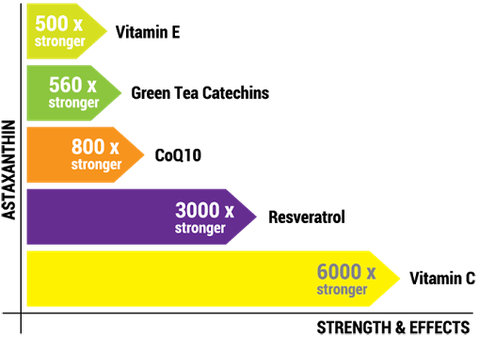 Các nghiên cứu khoa học đã cho thấy khả năng chống oxy hóa của Astaxanhthin mạnh hơn Vitamin C tới 6000 lần, gấp 500 lần so với Vitamin E và gấp 10 lần so với Beta-caroten. Astaxanhthin gần như là một chất chống oxy hóa “tinh khiết” và không có bất kỳ tác dụng phụ nào được ghi nhận.