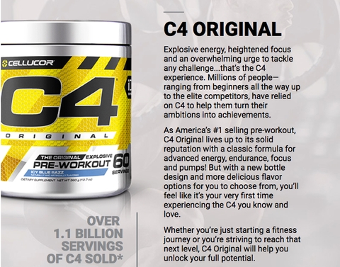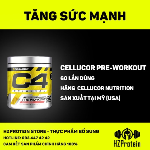 Cellucor C4 Original là cấp độ tiếp theo của sự đổi mới và tinh tế. Công thức của nó hiện nay đã được cải tiến, mạnh hơn, và bao gồm các thành phần mang tính đột phá, để cải thiện năng lượng trong khi tập hiệu quả hơn và kéo dài thời gian tập luyện.