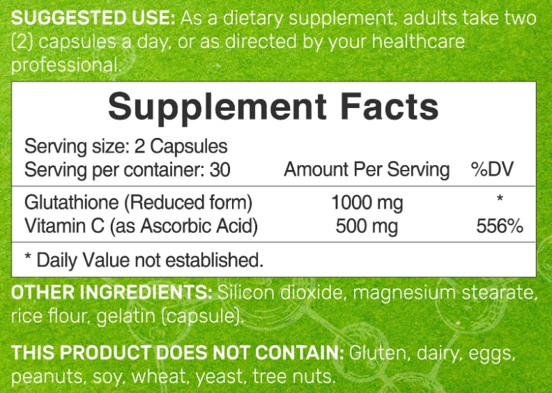 Glutathione Reduced 1000mg: Đây là một loại chất chống oxy hóa mạnh mẽ, có khả năng bảo vệ tế bào khỏi các tổn thương do các gốc tự do gây ra. Nó giúp giảm quá trình lão hóa da, hỗ trợ quá trình sản xuất collagen, giúp da săn chắc, mịn màng và trẻ trung hơn.