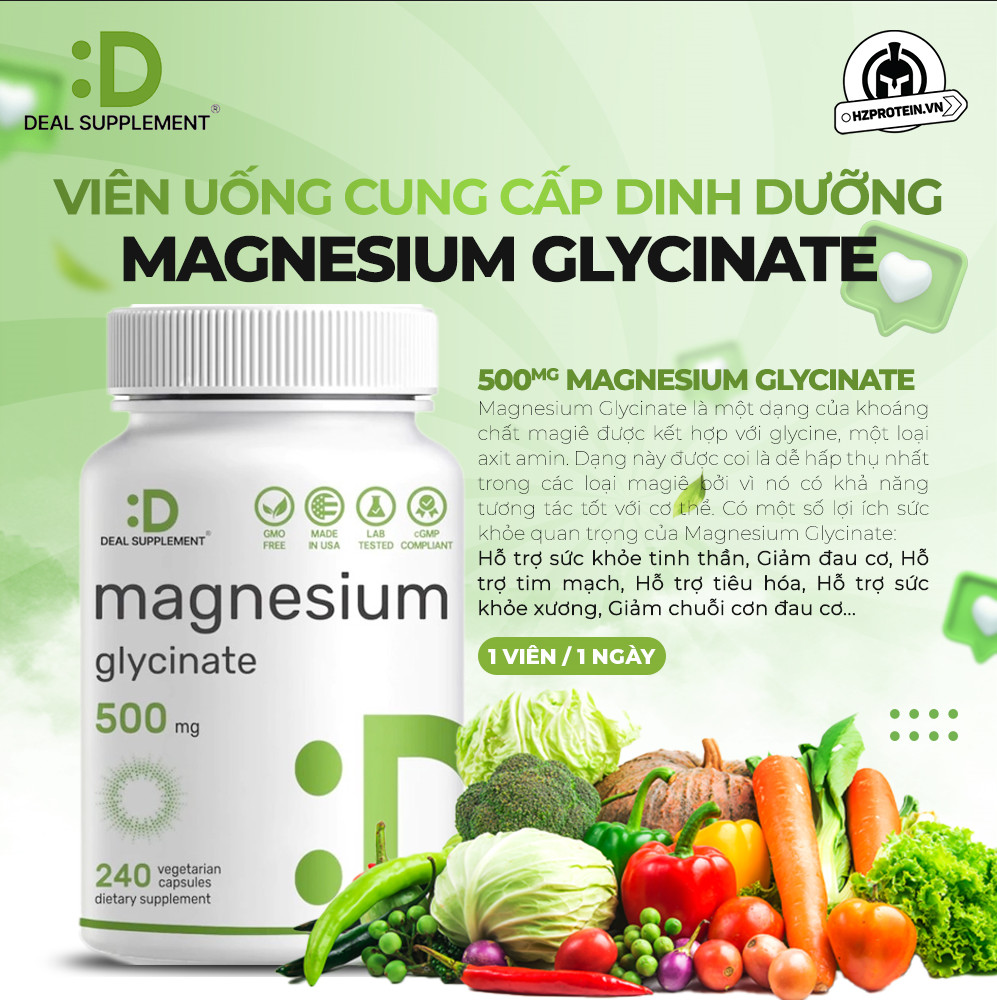 Deal Supplement Magnesium Glycinate 1000mg with Vitamin C là một sản phẩm bổ sung dinh dưỡng cao cấp giúp cung cấp lượng magnesium cần thiết cho cơ thể, đồng thời bổ sung thêm vitamin C để tăng cường hấp thu và tận dụng tối đa lợi ích của magnesium. Công dụng chính của sản phẩm bao gồm: