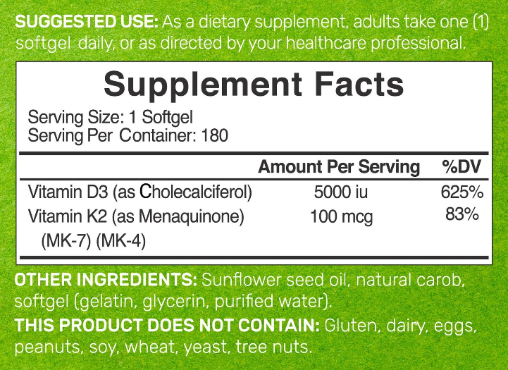 Deal Supplement Vitamin D3 + K2 5000IU chứa hai thành phần chính là vitamin D3 (5000IU) và vitamin K2 (100mcg).