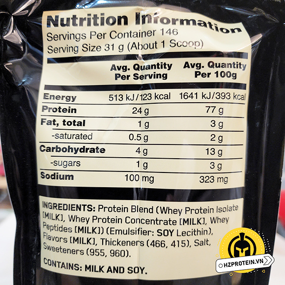 ▪️ Whey Protein là thành phần chủ yếu trong sản phẩm sữa tăng cơ Whey Gold Standard và ngoài ra, còn một số chất dinh dưỡng khác là: 140 calo, 24G Protein, 1g chất béo, 3 carb, 1g đường, 5.5g BCAA, 4g glutamine và axit glutamic trong mỗi muỗng.