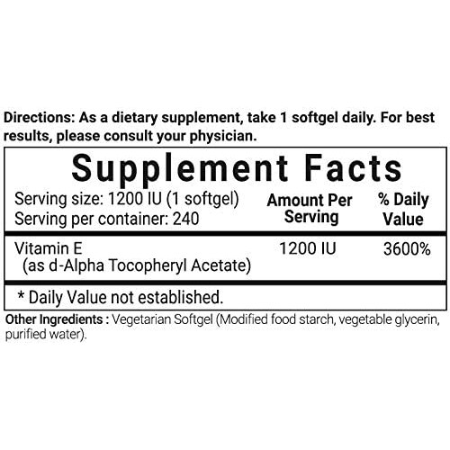 - Các chất bổ sung vitamin E có nguồn gốc tự nhiên (Viên nang vitamin E lỏng với dầu hạt hướng dương nguyên chất), 1200IU, 240 viên mềm, dễ nuốt, không biến đổi gen và thân thiện với người ăn chay.