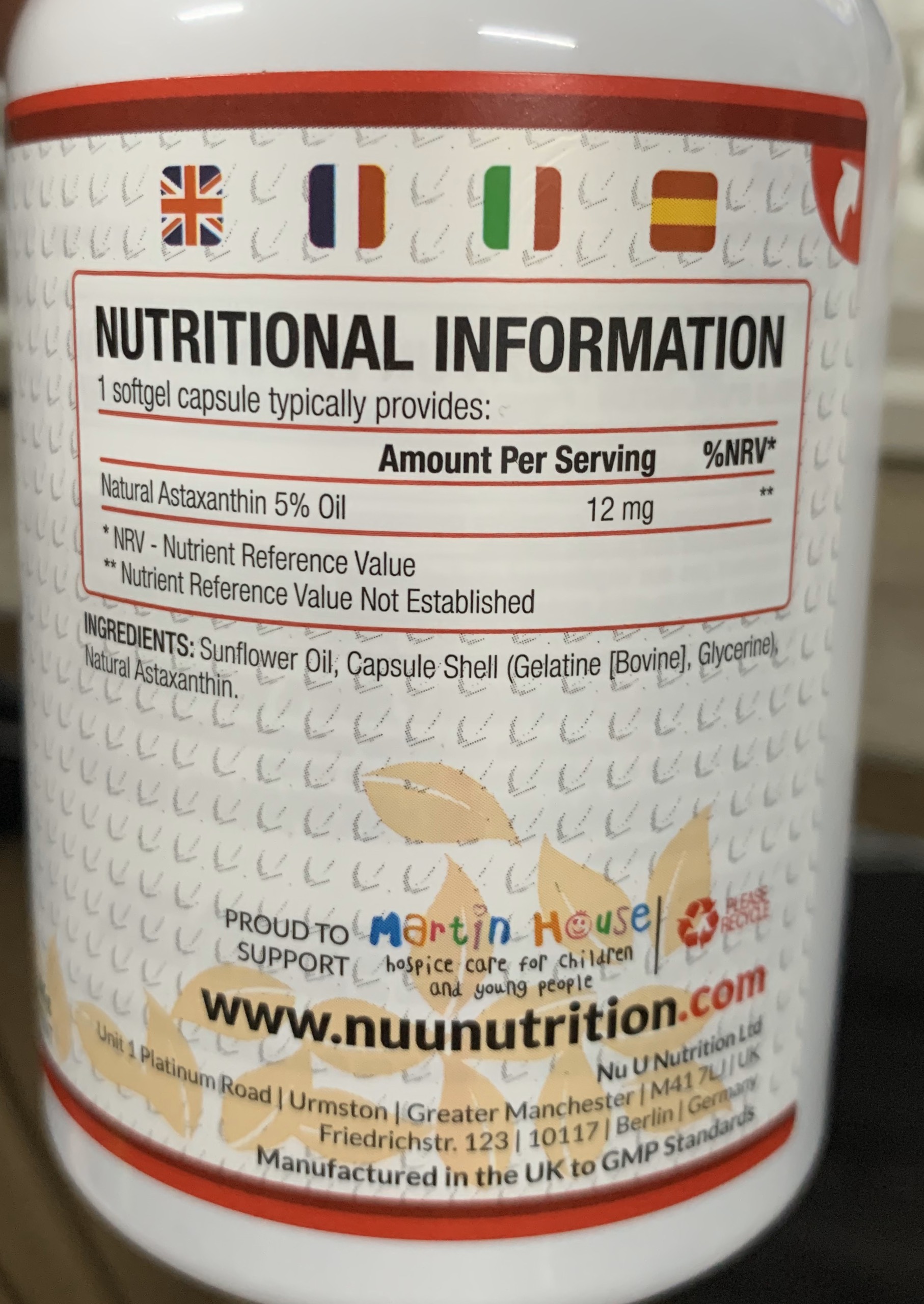 "Nu U Nutrition là một công ty sản xuất các sản phẩm bổ sung dinh dưỡng tại Anh. Tất cả các sản phẩm của Nu U, trong đó có Astaxanthin Natural 12mg đều được cam kết đảm bảo về chất lượng theo tiêu chuẩn quốc tế GMP, cụm từ viết tắt của Good Manufacturing Practices, là tiêu chuẩn thực hành sản xuất giúp kiểm soát các yếu tố ảnh hưởng đến quá trình sản xuất. Có được chứng nhận này nghĩa là sản phẩm của Nu U Nutrition được cam kết và đảm bảo về chất lượng cũng như an toàn cho người sử dụng."