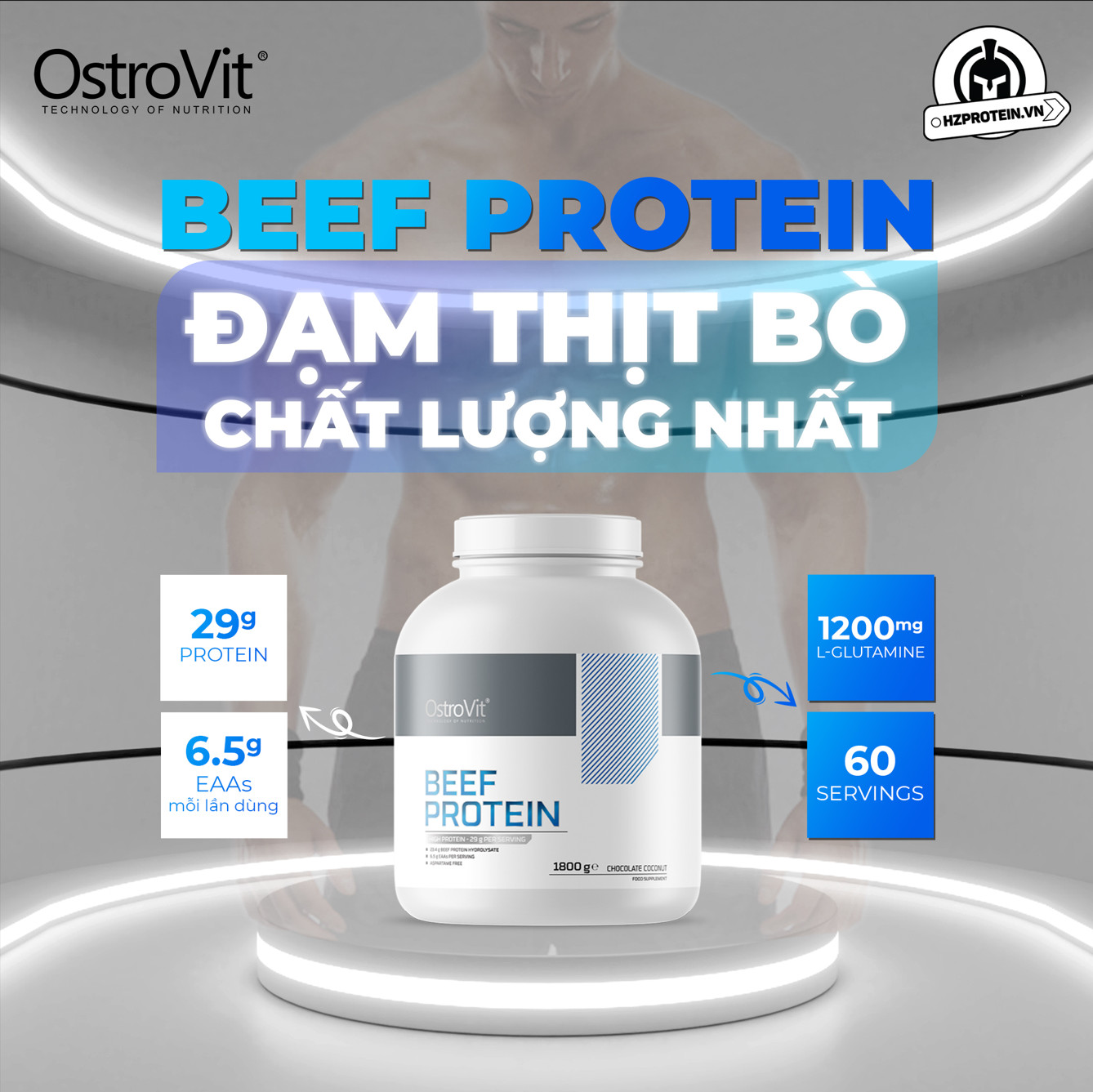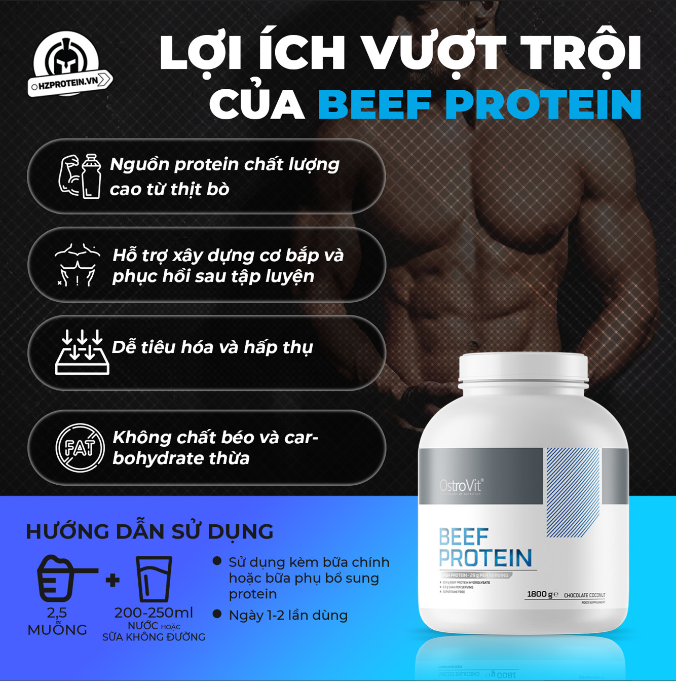 - OstroVit Beef Protein là protein thủy phân từ thịt bò có chất lượng cao nhất, được coi là nguồn protein tinh khiết nhất được sử dụng trong chế độ ăn kiêng của vận động viên, đặc trưng bởi tính khả dụng sinh học cao và giàu axit amin. Sản phẩm được tạo ra cho tất cả những người không dung nạp đường sữa và những người đang tìm kiếm một giải pháp thay thế cho bột whey protein truyền thống. Ostrovit Beef Protein được chiết xuất thông qua quá trình thuỷ phân enzyme từ thịt bò và làm giàu bằng amino acids và L-glutamine, L- arginene. Vì thế nên đây là một sản phẩm lý tưởng cho quá trình xây dựng cơ bắp cũng như giảm mỡ cơ thể