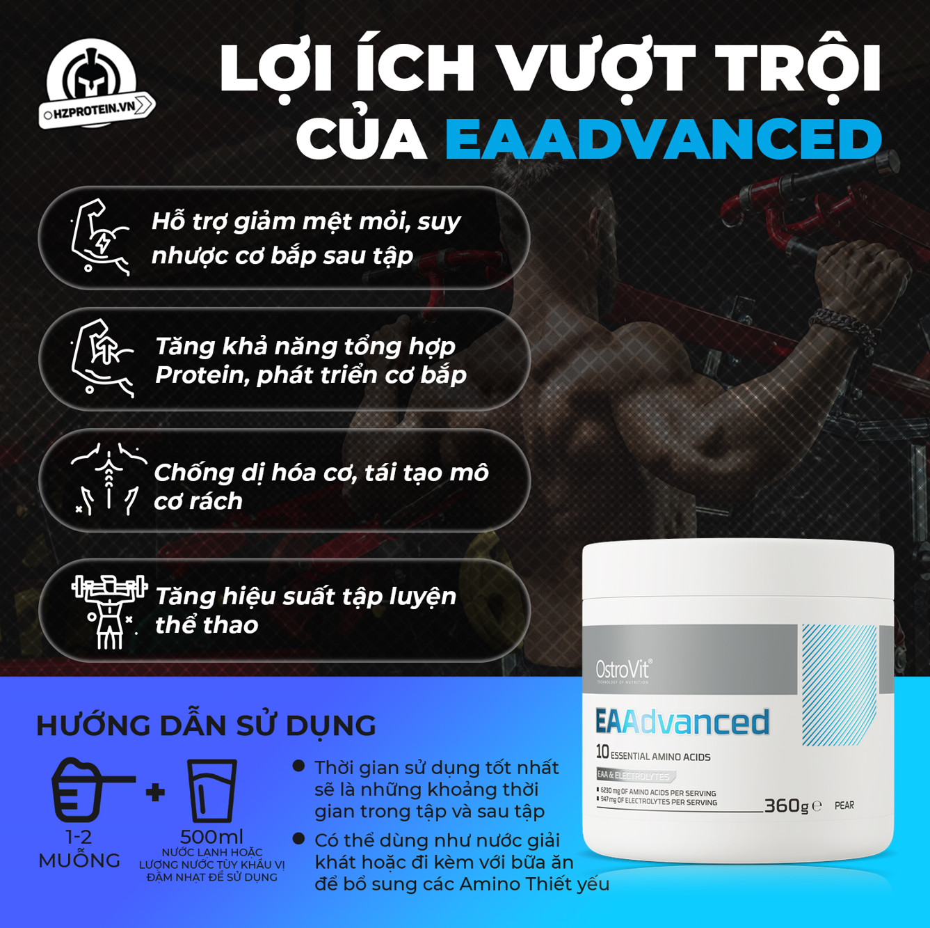 Axit amin EAA - Axit Amin thiết yếu - là một nhóm các axit amin thiết yếu: lysine, threonine, phenylalanine, methionine, arginine, histidine và tryptophan . Chúng cũng thuộc nhóm axit amin thiết yếu. Nhiệm vụ chính của axit amin EAA là bảo vệ cơ bắp khỏi quá trình dị hóa và cải thiện khả năng tái tạo sau tập luyện.
