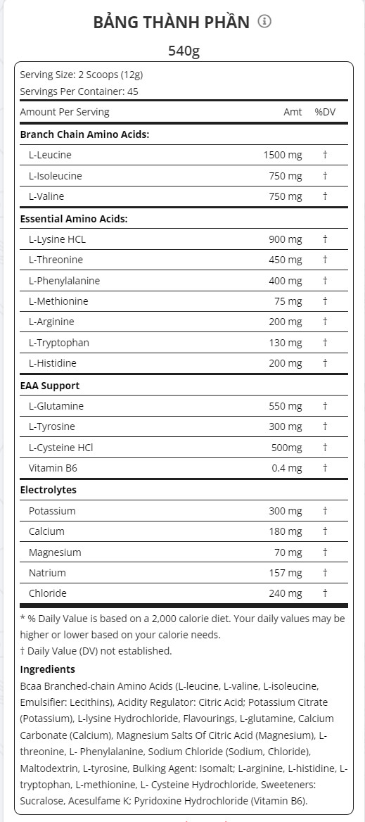 6375mg axit amin và 947mg chất điện giải mỗi khẩu phần