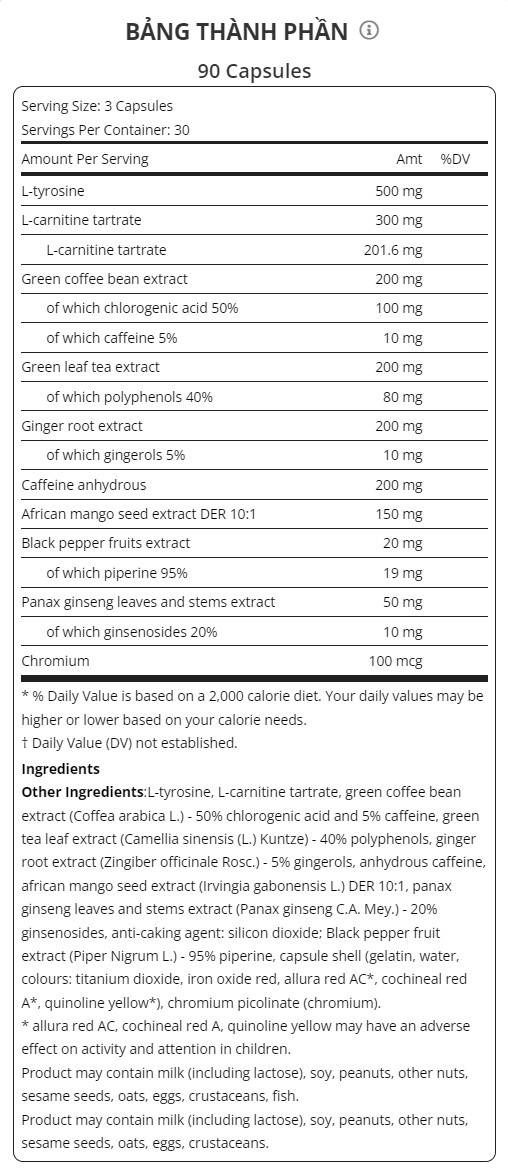 Chiết xuất cà phê xanh - có thể hạn chế chuyển hóa chất béo, tăng tốc độ trao đổi chất và là chất chống oxy hóa tuyệt vời.