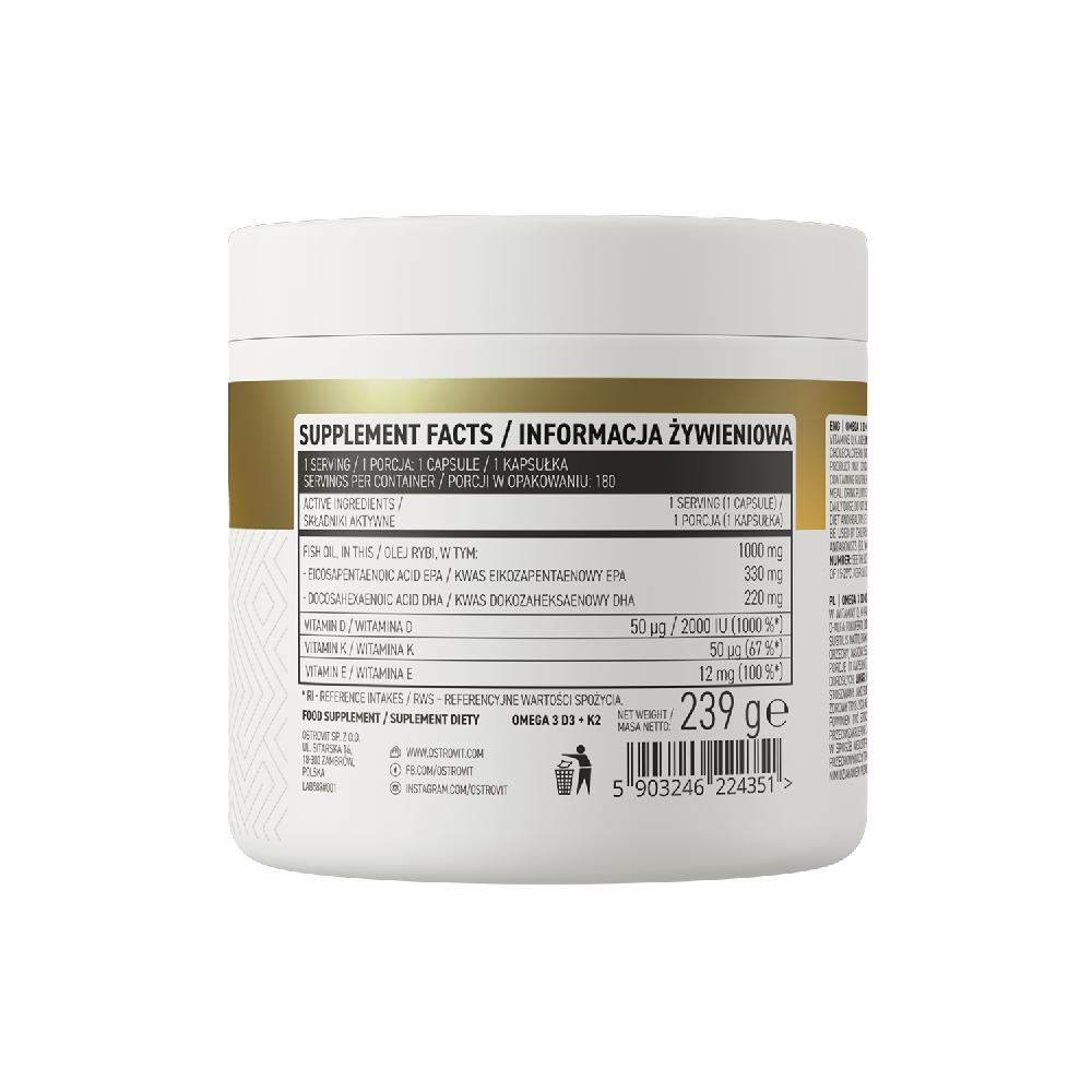Mỗi viên nang chứa 1000mg dầu cá, trong đó có 330 mg EPA và 220 mg DHA, được làm hoàn toàn từ thiên nhiên, an toàn và không gây hại cho sức khỏe cùng hàm lượng lớn Vitamin D3 K2 thiết yếu cho cơ thể. Đặc điểm Ostrovit Omega 3 D3 K2: