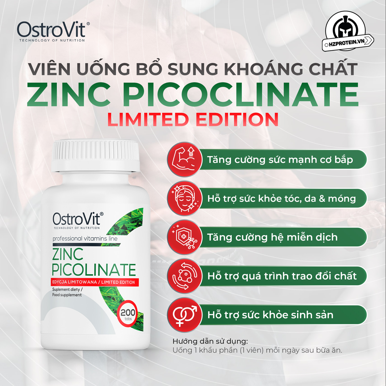 OstroVit Zinc Picolinate LIMITED EDITION là một chất bổ sung chế độ ăn uống ở dạng viên nén chứa kẽm ở dạng có khả năng sinh học cao là kẽm picolinate. Kẽm giúp duy trì tóc, da và móng khỏe mạnh. Ngoài ra, kẽm giúp duy trì mức testosterone bình thường trong máu và góp phần vào quá trình chuyển hóa chất dinh dưỡng đa lượng bình thường.