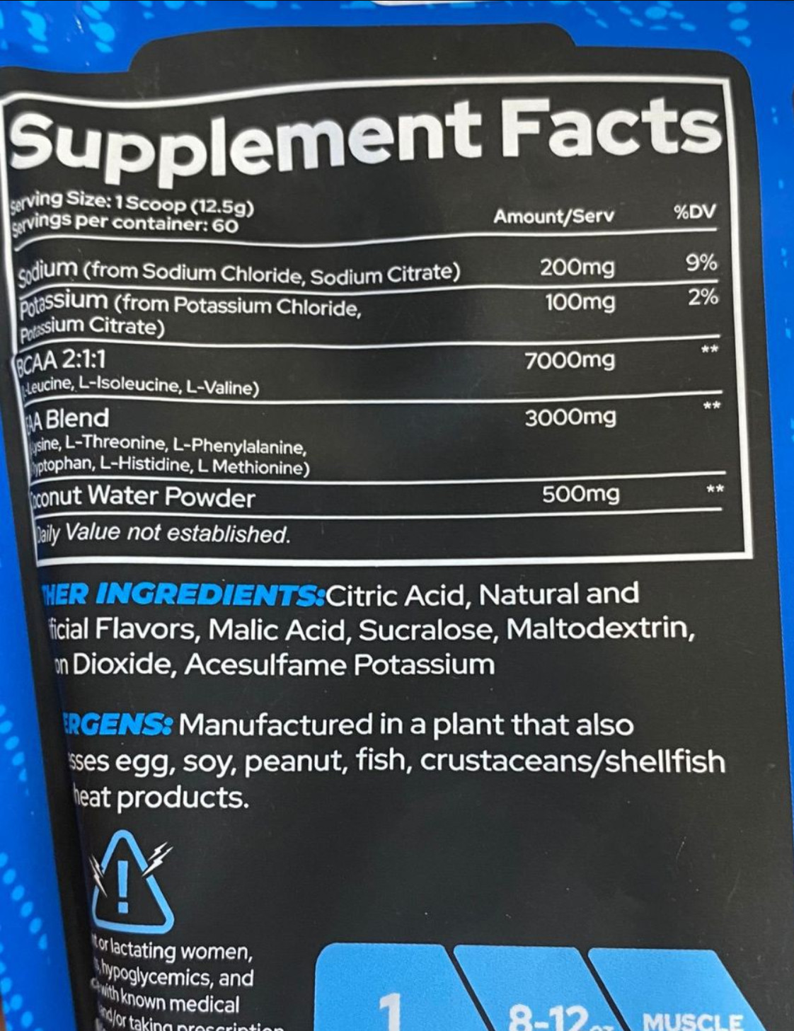 Chứa một hỗn hợp axit amin chủ đạo gồm Leucine, Isoleucine và Valine, cùng với các axit amin cần thiết như Lysine, Threonine, Phenylalanine, Methionine, Histidine, Tryptophan và Cystine. Hỗn hợp này giúp đáp ứng nhu cầu axit amin của cơ thể trong quá trình tập luyện và phục hồi cơ bắp sau đó.