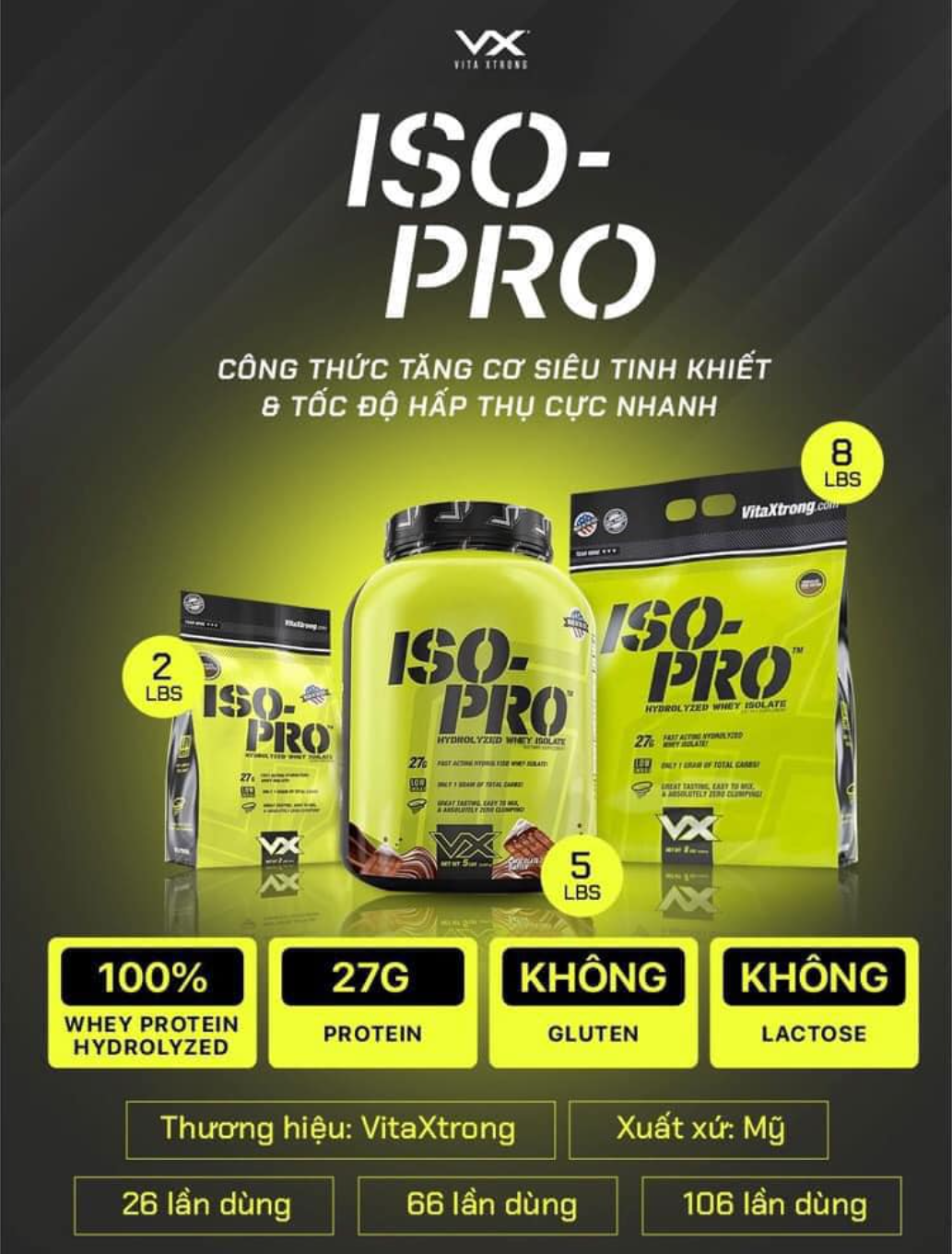 Whey ISO Pro là dòng Whey Hydrolyzed cao cấp hấp thu nhanh xuất xứ Mỹ do VitaXtrong sản xuất. Dòng sữa tăng cơ này rất được ưa chuộng tại Mỹ và các nước Châu Âu, nhưng còn khá mới mẻ ở Việt Nam.