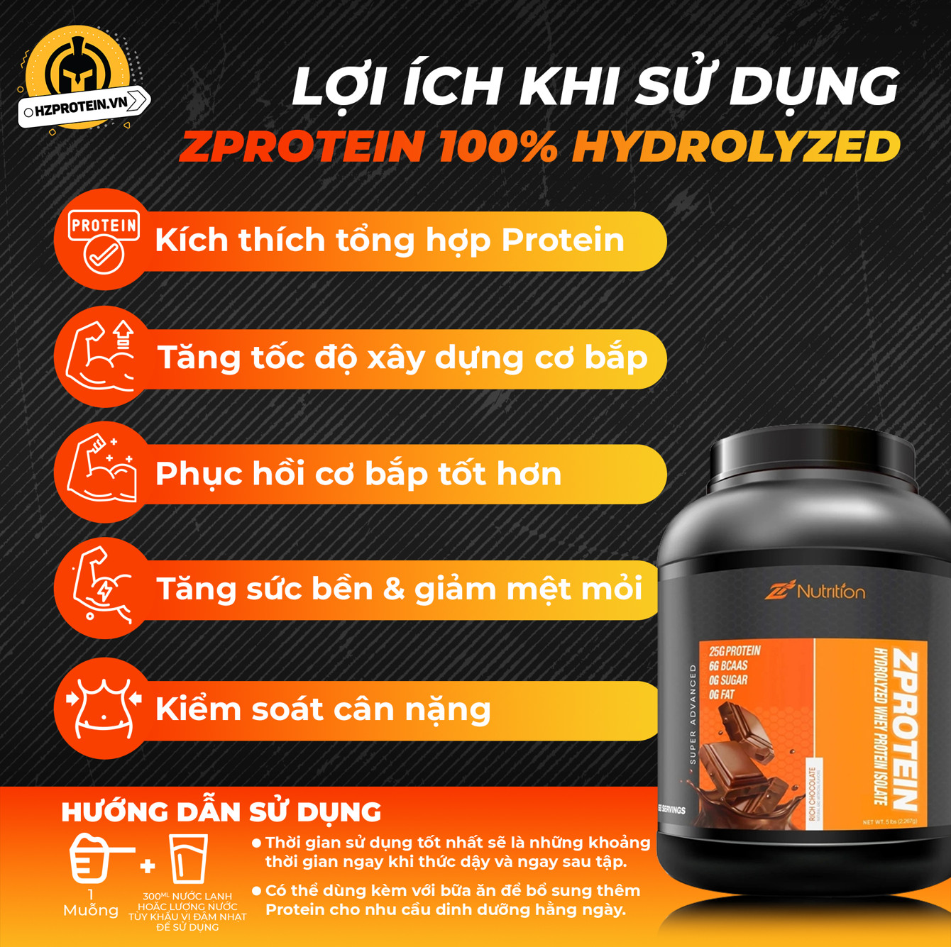 - Hỗ trợ phát triển cơ bắp vượt trội, với hàm lượng Protein cực lớn, lên tới 92% protein / lần dùng. ZProtein 100% Hydrolyzed đang là sản phẩm cao cấp, chất lượng và đáng dùng hàng đầu hiện nay.